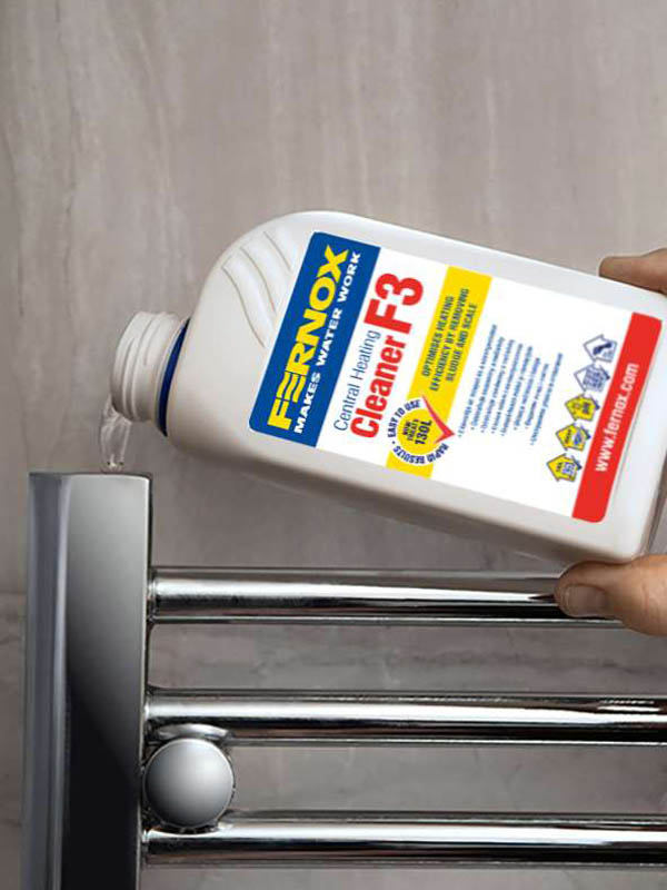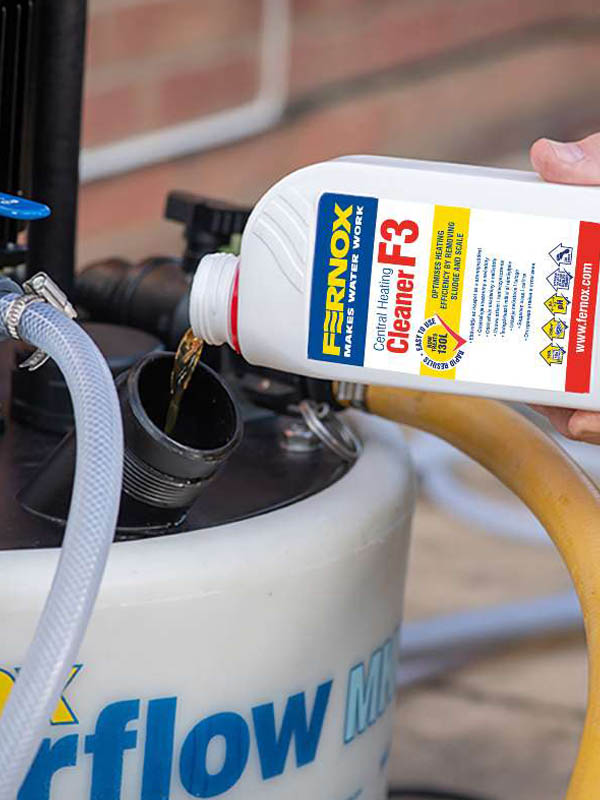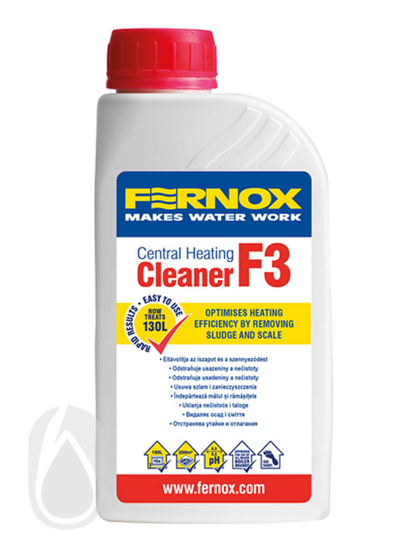 Čistiaca kvapalina Fernox Cleaner F3 je rýchly a účinný neutrálny čistič pre ústredné vykurovania. Je určený k odstraňovaniu všetkých nečistôt, kalu a vodného kameňa. Obnovuje účinnosť vykurovania a odstraňuje či znižuje hluk kotla. Bol navrhnutý pre čistenie nových inštalácií pred spustením v zhode s BS7593:1992, odstraňuje zbytky montážnej pasty a iné nečistoty, čím pomáha predlžovať životnosť systému.